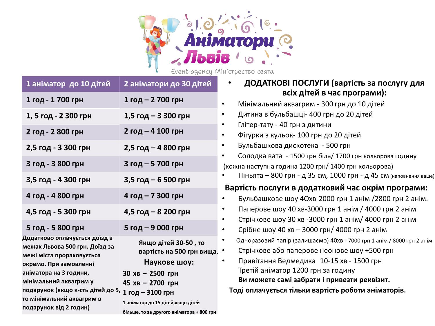 1 година роботи 2 аніматорів (до 50 дітей) – 3200 грн.