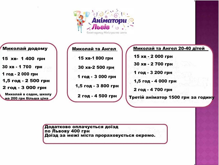 Вже сьогодні Ви можете замовити Святого Миколая додому, в садочок, на шкільне свято! Разом з ним прийде і Ангел. Вони розкажуть Вашій дитині коротеньку та цікаву історію про Миколая, проведуть міні-діалог з Вашою дитиною та вручать подарунок! А потім можете провести фотосесію. Привітання проходить під музичний супровід, виглядає, як театралізоване дійство!