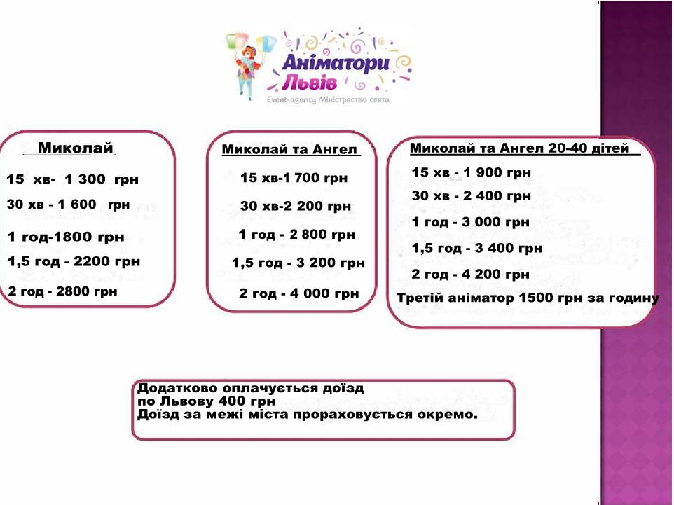 Вже сьогодні Ви можете замовити Святого Миколая додому, в садочок, на шкільне свято! Разом з ним прийде і Ангел. Вони розкажуть Вашій дитині коротеньку та цікаву історію про Миколая, проведуть міні-діалог з Вашою дитиною та вручать подарунок! А потім можете провести фотосесію. Привітання проходить під музичний супровід, виглядає, як театралізоване дійство!